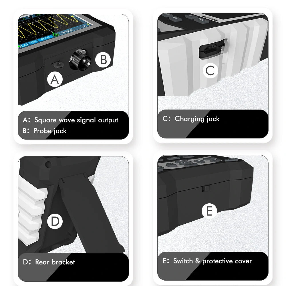 Introducing the professional oscilloscope crafted by the MUSTOOL Team. With a bandwidth of 120MHz and a sampling rate of 500MSps, this oscilloscope delivers exceptional performance. Not only does it function as an oscilloscope, but it also features four square wave signal output speeds: 1kHz, 10kHz, 100kHz, and 1MHz.