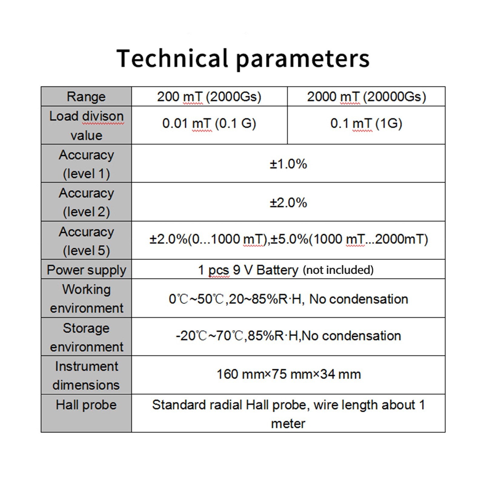 - Resolution: 0.01mT (1Gs), 0.1mT (1Gs)